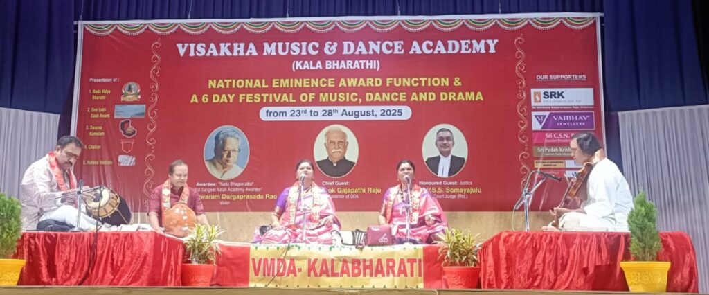 Visakhapatnam Vizagvision: విశాఖ మ్యూజికల్ డాన్స్ అకాడమీ కళాభారతి 2025 సంవత్సరంలో వార్షిక సంగీత నృత్య నాటక ఉత్సవాల్లో భాగంగా ఈరోజు మూడవరోజు. ప్రఖ్యాత గాత్ర విద్వాంసులు విజయవాడ వాస్తవ్యులు విష్ణుభట్ల సిస్టర్స్ గా పేరుగాంచిన వారి గాత్ర సంగీత కచేరి జరిగింది. కచరేకి ముందు కళాభారతి అధ్యక్షులు MSN రాజు, కార్యదర్శి ‘ శ్రీరామదాస’ డాక్టర్ రాంబాబు, కోశాధికారి శ్రీ పైడా కృష్ణ ప్రసాద్, శ్రీ పిల్ల రమణమూర్తి, విష్ణు భట్ల సిస్టర్స్ జ్యోతి ప్రకాశనం చేసి శుభారంభం చేశారు. తర్వాత జరిగిన విష్ణుభట్ల సోదరిమనుల సంగీత కచేరిలో మొదటగా శాస్త్రీయబద్ధంగా ‘ఏమని వర్ణింతు” వర్ణం ఆదితాళం, రసిక ప్రియరాగంలో గానం చేసి శుభారంభం చేశారు. తర్వాత అంశంగా” శ్రీ మహాగణపతిం భజే” అఠాణరాగం లో ఆది తాళంలో చక్కగా గానం చేశారు.తర్వాత అంశం” నన్ను విడచి కదలకురా ” రీతిగౌళ రాగంలో, మిశ్ర చాపు తాళం లో త్యాగరా స్వామి కీర్తన రాగాలాపన, స్వర కల్పన అద్భుతంగా చేసి ప్రేక్షకుల మెప్పును పొందారు గాయని మణులు. తర్వాత అంశంగా” కామాక్షి కామకోటి పీఠ వాసిని” సుమనధ్యుతి రాగంలో రూపకతాళంలో దీక్షితర్ వారి కీర్తన చాలా రసరమ్యంగా గానం చేసారు.తరువాత “నన్ను విడిచి కదలకు రా” రీతి గౌళ రాగం,తరువాత ” పాలించు కామాక్షి” మద్యమావతి రాగం, ఆదితాళంలో శ్రీ శ్యామశాస్త్రి గారి రచనను గానం చేసి శభాష్ అనిపించుకున్నారు. చివరగా “సొంపైన మనసుతో” త్యాగరాజ స్వామి వారి కీర్తనని గానం చేశారు.చివరిగా శ్రీరామదాసు, అన్నమయ్య కీర్తనలు పాడి మంగళంతో ముగించాటు.ప్రధాన అంశంలో వైయోలిన్ పై సహకరించిన డాక్టర్ మావుడూరి సత్యనారాయణ శర్మ చాలా ఉన్నత స్థాయిలో సహకరించి అందరి చేత శభాష్ అనిపించుకున్నారు. శ్రీ BVS ప్రసాద్ మృదంగంపై, హరి బాబు ఘటంపై ఇద్దరూ పోటీపడి అత్యంత అద్భుతంగా వాయించిన తీరు ఒక జుగల్ బంది లా సాగి అందరికి అభిమానాన్ని చూరగొన్నారు. వైలెన్, మదంగం,ఘటం పై సహకారం అందించి కచేరి స్థాయిని పెంచే విధంగా సాగి అందరి హర్షద్వానాలను పొందారు. కచేరి అనంతరం డాక్టర్ రాంబాబు మాట్లాడుతూ రేపటి కార్యక్రమం బెంగళూరు బ్రదర్స్ గా ప్రసిద్ధిగాంచిన గాయకులు కర్ణాటక గాత్ర సంగీత యుగళo ఉంటుందని వారికి శ్రీ ఎం.ఎస్.ఎన్ మూర్తి వయోలిన్ పై, Dr.వంకాయల వెంకటరమణ మృదంగంపై, శ్రీ హరిబాబు ఘటంపై సహకరించనున్నారని ఈ గొప్ప కచేరి కూడా అందరూ శ్రోతలు వచ్చి ఆనందించాలని కోరారు.
