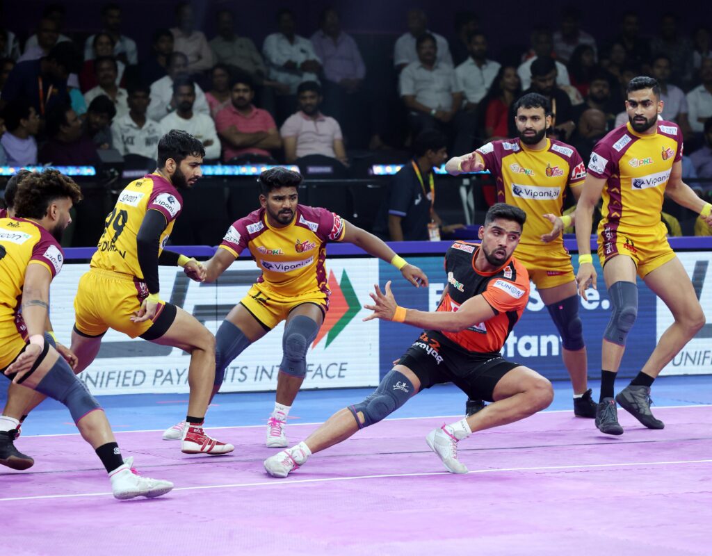 It was an impressive finish to the Vizag leg for the home side Telugu Titans, who secured a 45-37 win over U Mumba at the Vishwanadh Sports Club on Wednesday night. Bharat Hooda led the charge with 13 points, while Chetan Sahu (6 points) and skipper Vijay Malik (5 points) played strong supporting roles, helping the Titans notch their third victory on the trot.